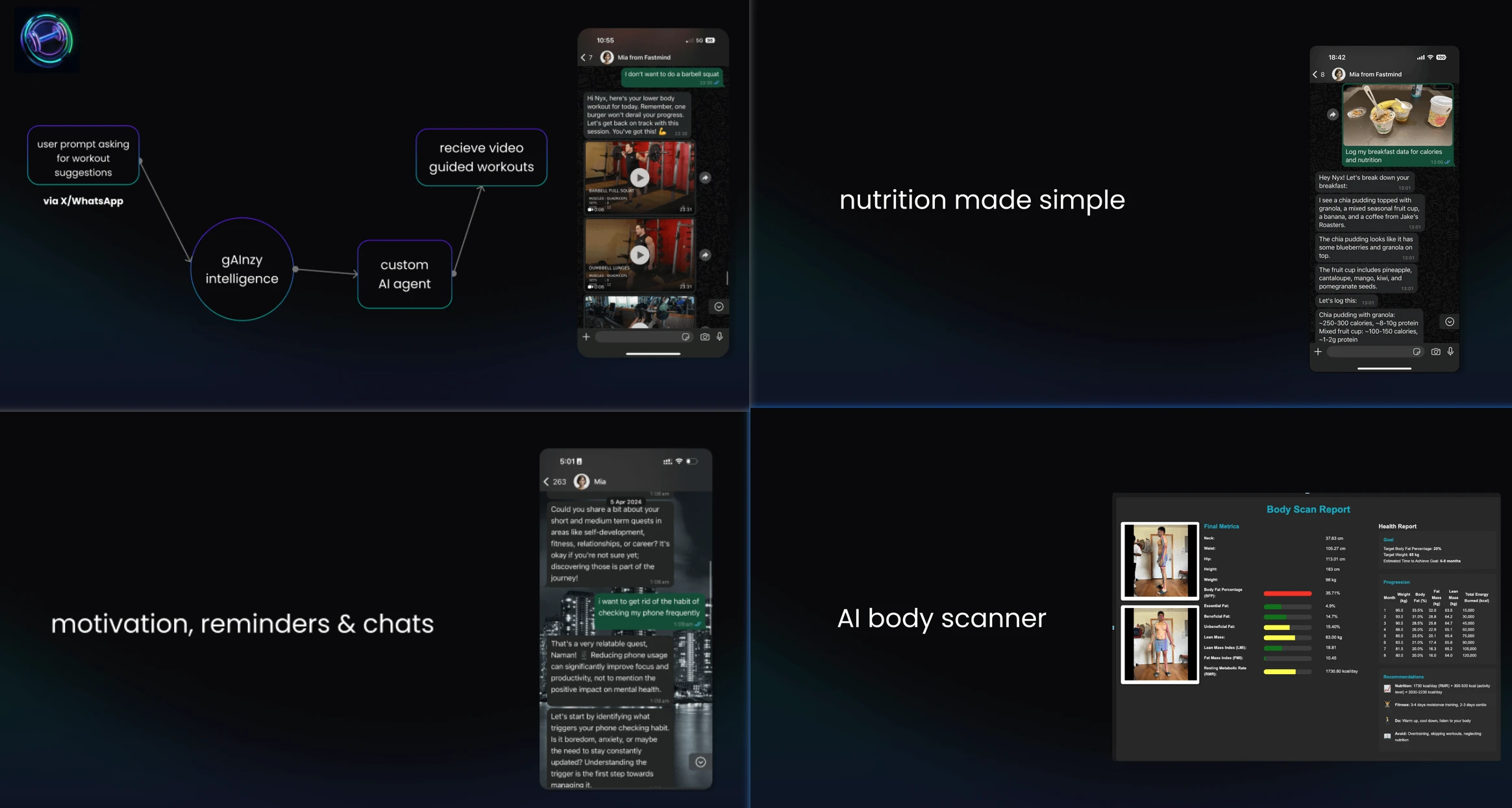 GNZ(gAInz)项目本身可以概括为一个基于 AI 的健康管家,其功能包括:AI 定制的健身计划(AI 版 Keep)、AI 营养管理(用户将餐食发送给 AI,AI 进行热量和营养判断)、健身话题的聊天伴侣、身体分析(上传照片,AI 评价肌肉质量、体型等)。