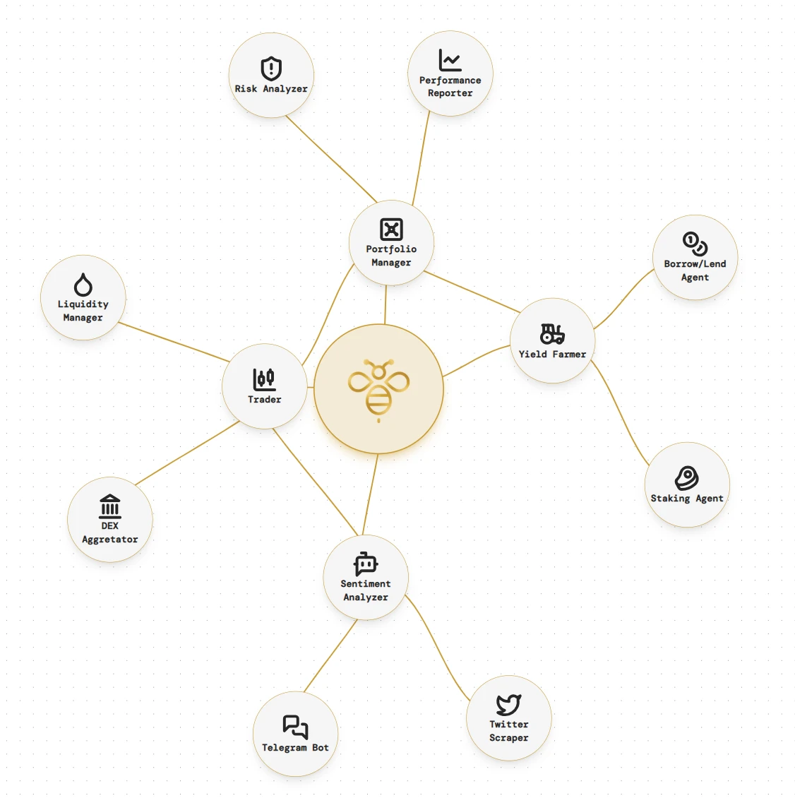 AI+DeFi 概念,用户能够基于“The Hive”,使用自然语言指挥 AI 进行 DeFi 操作,包括交易、质押、流动性管理和情绪分析等。其概念上的特点主要在于不同的操作由专门的 AI Agent 管理,生态之间的组件能够自由组合,也能使用标准化框架集成第三方工具。