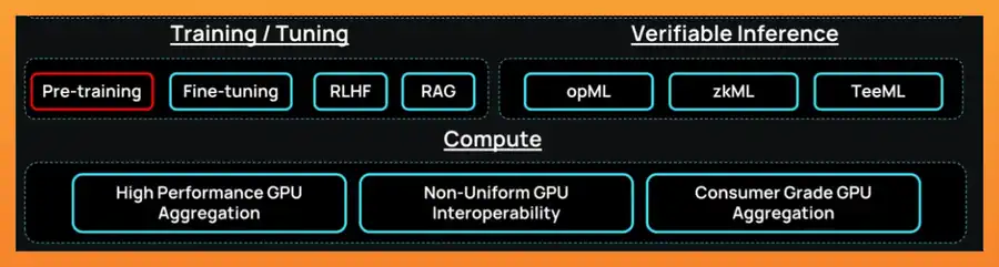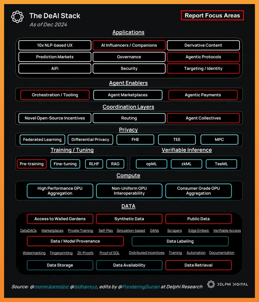Delphi Digital 已经做出了相当清晰的「去中心化 AI」堆栈分类,这里有 6 个重点方向(我认为这些方向具有高潜力),每个方向下都有一些「子行业」。你可以把它们称为叙事或创新方向。我可以保证,每个子行业都会有一个领头者,在接下来的几个月里达到至少 5 亿的市值。
