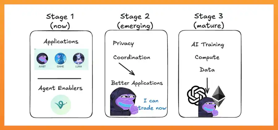 我们现在正处于这一阶段——想象一下你在 X(aixbt agent)看到的简单聊天机器人互动,这些 agent 主要充当研究助理和人类意图的执行层。虽然有价值,但它们并不需要革命性的基础设施变革。现在,大多数 agent 看起来像是量身定制的 ChatGPT,帮助你进行简单的研究。这些 agent 并不具备高度的自主性。它们不能独立管理资源、承担风险或支付其他服务费用。