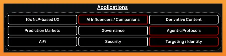 正如上面提到的,我看好即将到来的 DEFAI(DeFi 与 AI 的结合)叙事。这符合我对阶段 2 (agent 对人类)的假设。一个很好的起点是通过以下的 DeFi x AI 项目及其细分领域进行学习: