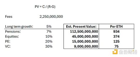 即便如此,该论文还是基于慷慨的假设进行了尝试,即发行是净中性的,加上平均增长率为 5%。然而,无论使用何种折现率,「ETH 如今作为 4000 亿美元的现金流资产似乎被严重高估了。」
