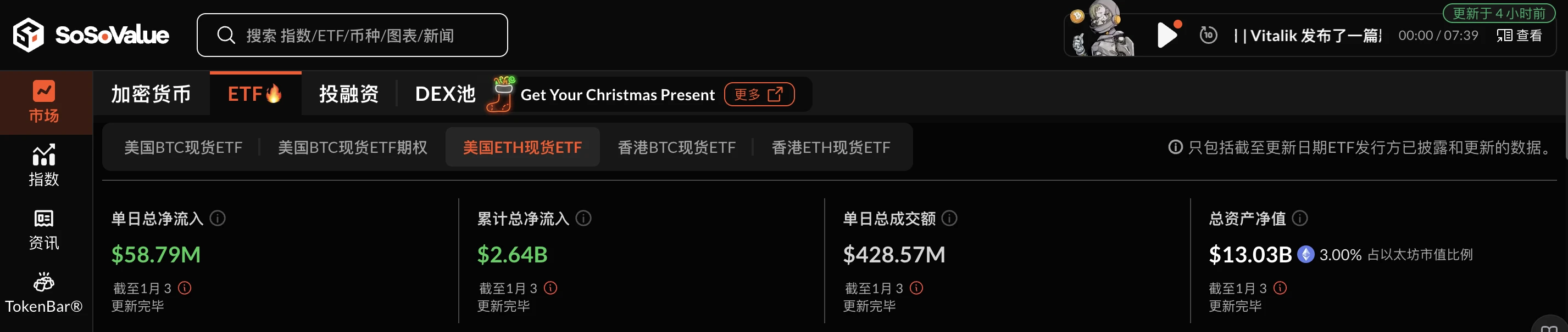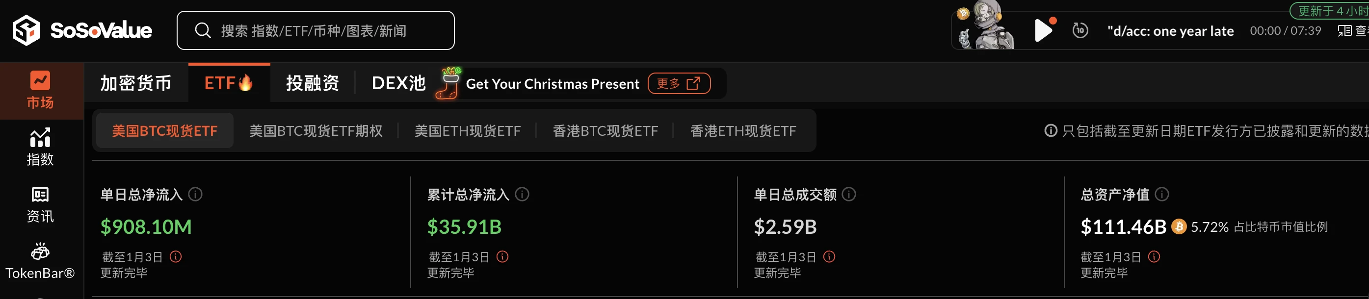 根据 SoSoValue 数据,截止 1 月 3 日,比特币现货 ETF 总资产净值为 1114.6 亿美元,ETF 净资产比率(市值较比特币总市值占比)达 5.72% ,历史累计净流入达 359.1 亿美元;以太坊现货 ETF 总资产净值为 130.3 亿美元,ETF 净资产率(市值较以太坊总市值占比)为 3% ,历史累计净流入达 26.4 亿美元。