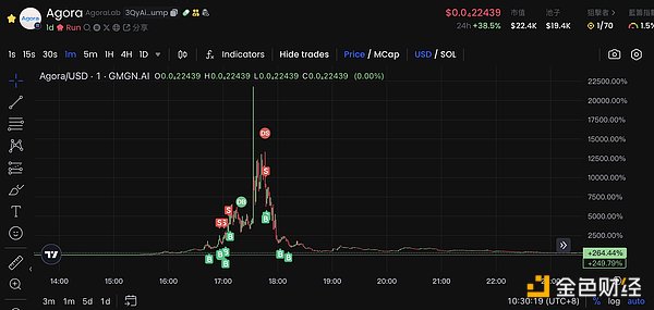 以 MEME 代币 Agora 为例,投资者经初步判断项目有上涨的潜力,随后进行 Scalping 交易套利,多笔 Scalping 使得投资者本金迅速翻倍,而这仅仅是开始,倒数第二笔买入后,Agora 在 30 分钟内迅速拉到 15 倍涨幅,由于 Web 端的交易界面没有止盈止损,实际利润远未达到 15 倍,但在 15 倍涨幅的刺激下,投资者陷入继续投机的循环,最终在波动中损失殆尽。