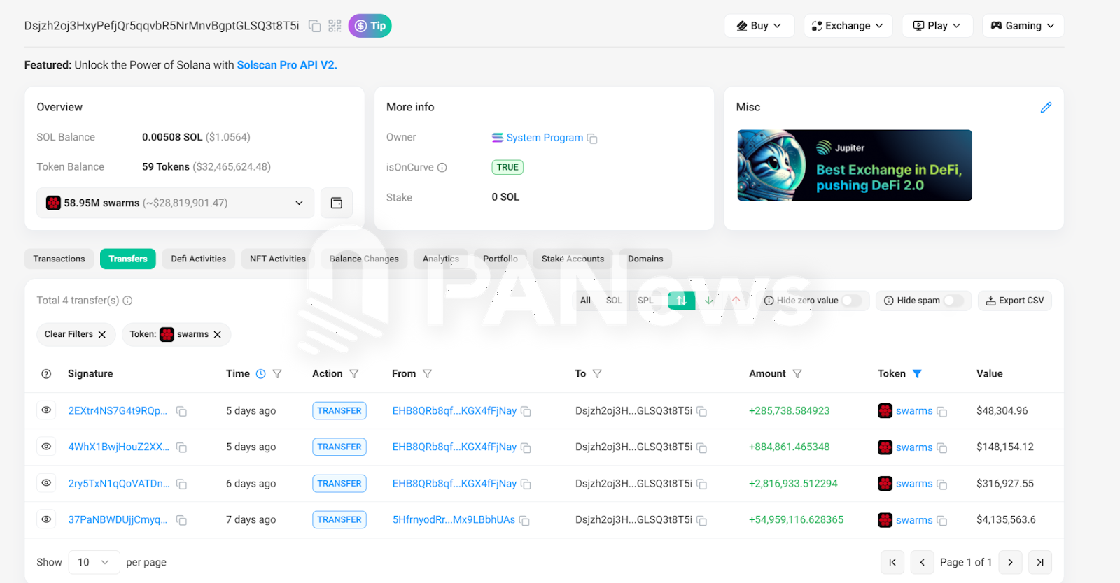 此外,另一个地址5NQTp9jHbzS4N9yKMWxwm8pPZW3RFSFPze3Edwss7iLe在1月4日转入价值约363万美元的Swarms代币,根据链上踪迹来看,该地址也是通过几个地址在1月2日左右分散购买,最终将代币归集到一个地址当中,目前该地址的持仓价值约为526万美元。