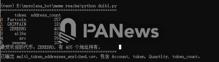 除了对Swarms的代币地址进行分析之外,PANews还针对Fartcoin、GRIFFAIN、ZEREBRO、ai16z、arc、swarms等6个地址的前1000名持仓地址进行对比分析。在分析中能够看到,在参与分析的6000个地址当中,有1647个地址重复出现,也就是说有约为27%的地址购买了多个AI Agent相关代币,其中ZEREBRO似乎是AI大户们最钟爱的代币,有405个地址购买了这个代币。其次是arc(368个)、ai16z(334个)。