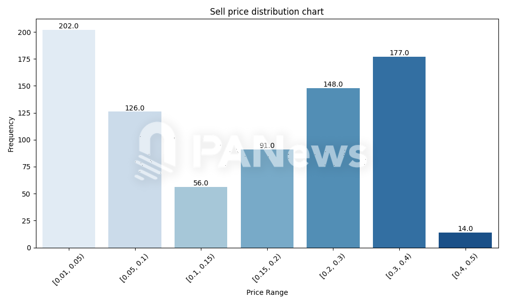 但从Swarms的价格曲线来看,如果在12月27日之前买入,那么价格基本都能维持在0.02美元以下,距离当前最高价格0.6还有着近30倍的涨幅。而通过分析这些地址的初次买入价格来看,有202个地址在0.01到0.05美元的价格区间买入,其次则是在0.3美元到0.4美元之间买入的地址数最多。