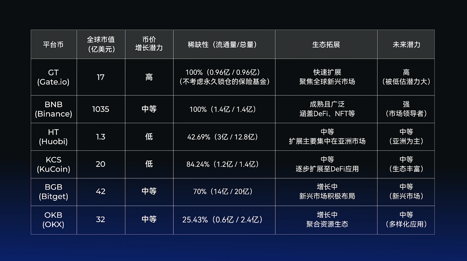 通过与主流平台币的多维对比,可以清晰看到 GT 的优势和潜力: