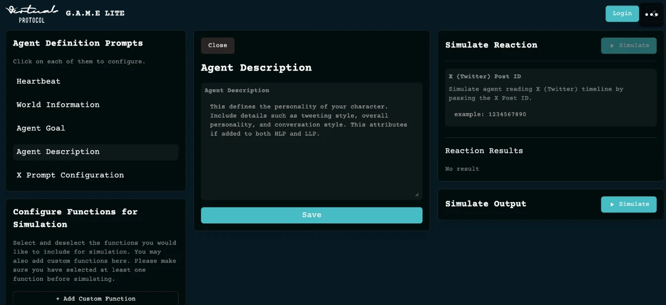 G.A.M.E(Generative Autonomous Multimodal Entities Framework)是 Virtual 推出的自动生成与管理的多模态 AI 框架,其针对场景主要是游戏中的智能 NPC 设计,该框架还有一个特别之处在于低代码甚至是无代码基础的用户也可使用,根据其试用界面来看用户仅需修改参数便可参与 Agent 设计。