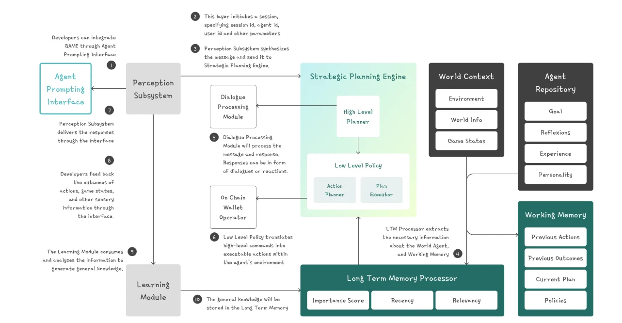 工作流程:开发者通过 Agent 提示界面启动 Agent,感知子系统接收输入并将其传递给战略规划引擎。战略规划引擎利用记忆系统、世界上下文和 Agent 库中的信息,制定并执行行动计划。学习模块则持续监控 Agent 的行动结果,并根据结果调整 Agent 的行为。