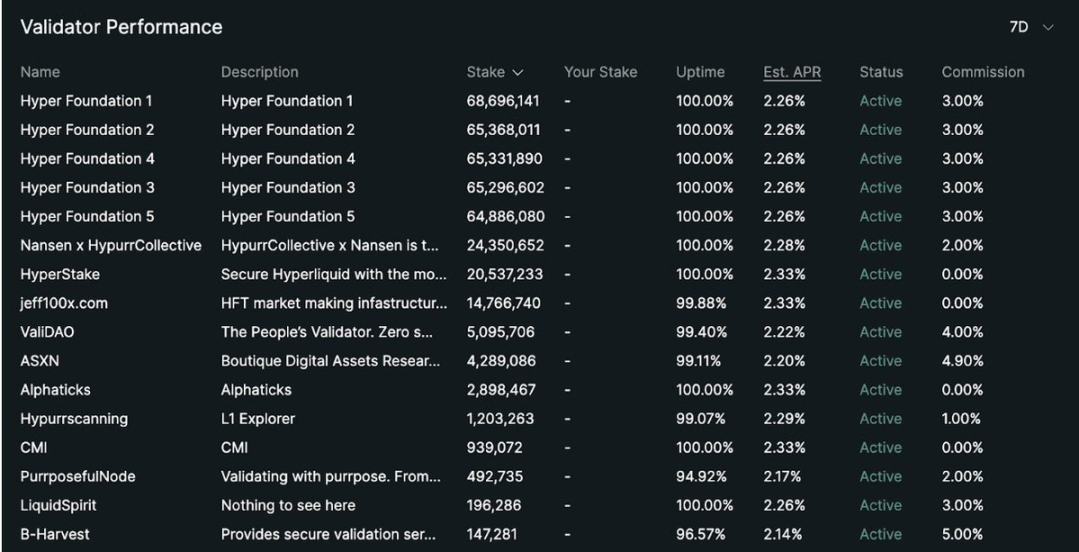 如前所述,Hyperliquid 主网上目前的验证者集合由 16 名验证者组成,可在此查看:https://app.hyperliquid.xyz/staking。