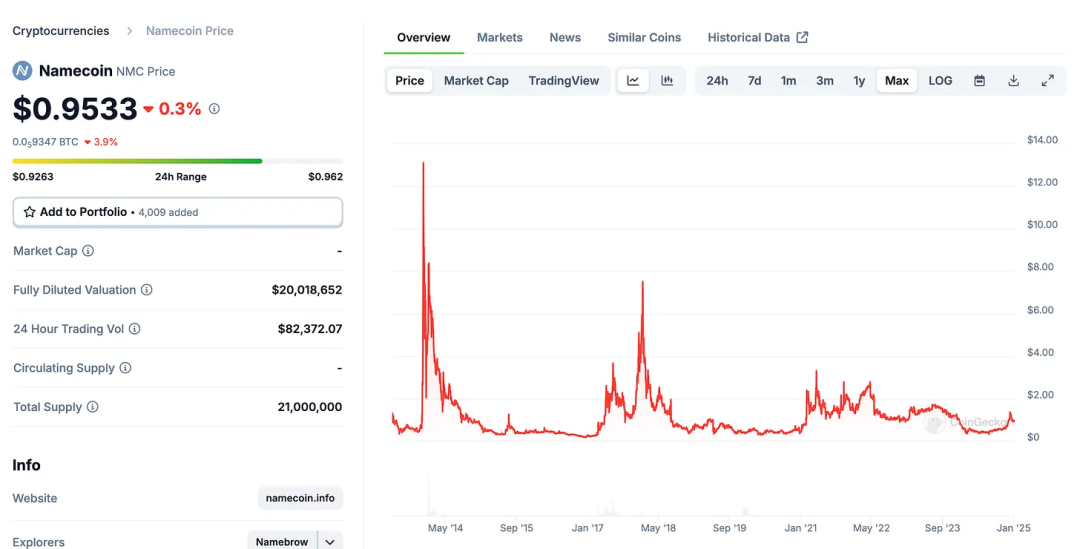 Namecoin:这是一种比特币的分叉币,旨在创建去中心化的网络域名(类似于ENS通过“.eth”扩展的概念)。它的价格曾一度飙升至约13美元,但很快就跌入低谷。从最低点到最高点,它的价格上涨了大约30倍。事实上,它至今仍然存在,当前的交易价格接近1美元。