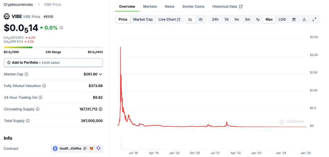 VIBE的价格曾从0.04美元飙升至超过2美元,但最终其总市值却跌到了仅262美元。
