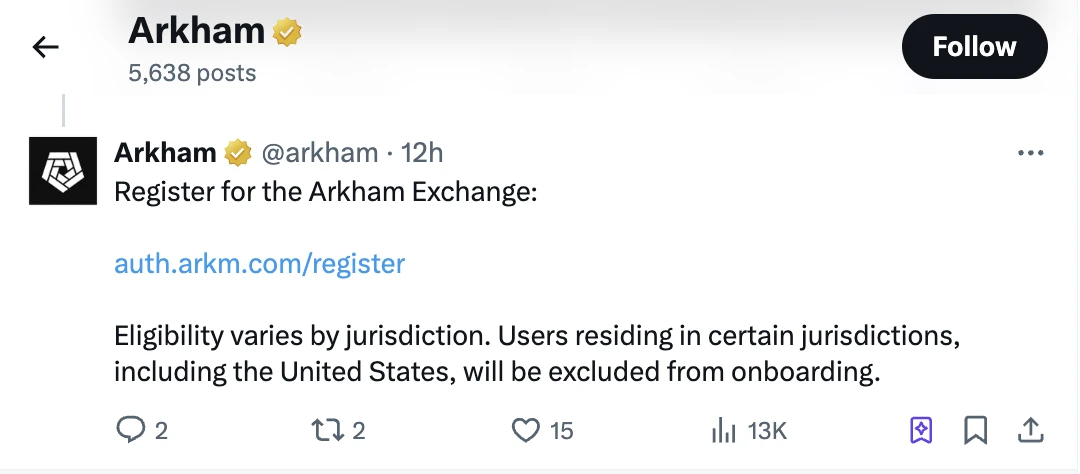 去年11月,Arkham 官方宣布 将上线衍生品交易所 ARKHAM PERPETUALS EXCHANGE,并于之后上线了 交易所积分(ARKHAM EXCHANGE POINTS)系统 ,鼓励用户交易获得积分。随后官方在多条 X 平台推文下都有引流注册的动作,但目前来看收效甚微。