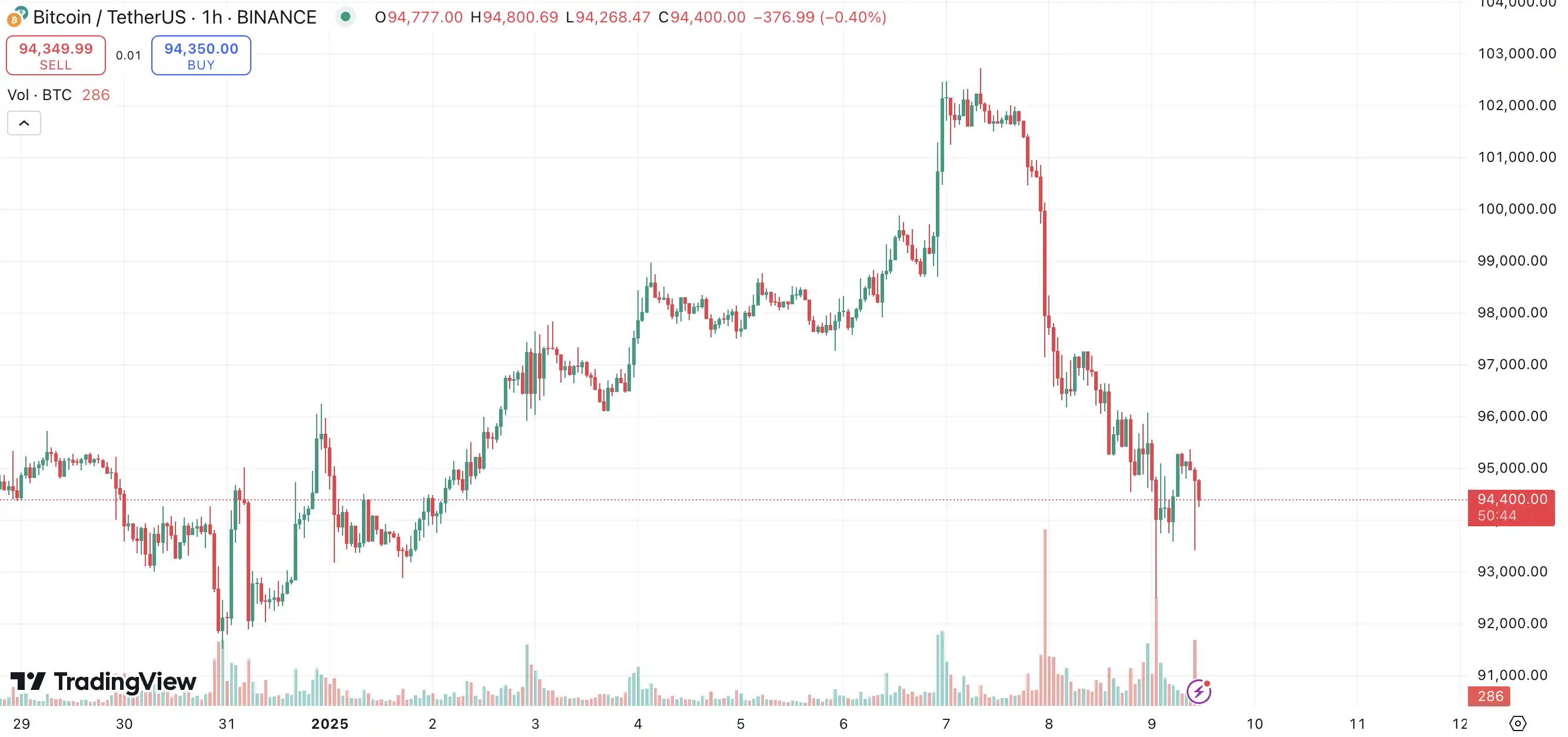 消息爆出后,比特币 24 小时跌超 2.5% ,截止撰稿时,价格为 94, 400 美元。