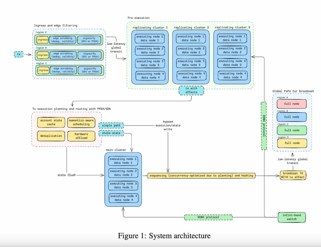 3、排序和调度:交易结果和中间快照通过 InfiniBand(提供专为高性能计算和数据中心环境量身定制的高速、低延迟网络架构)发送到排序器。排序器使用 SDN 交换机和 FPGA 来决定交易是走简单路径还是复杂路径。