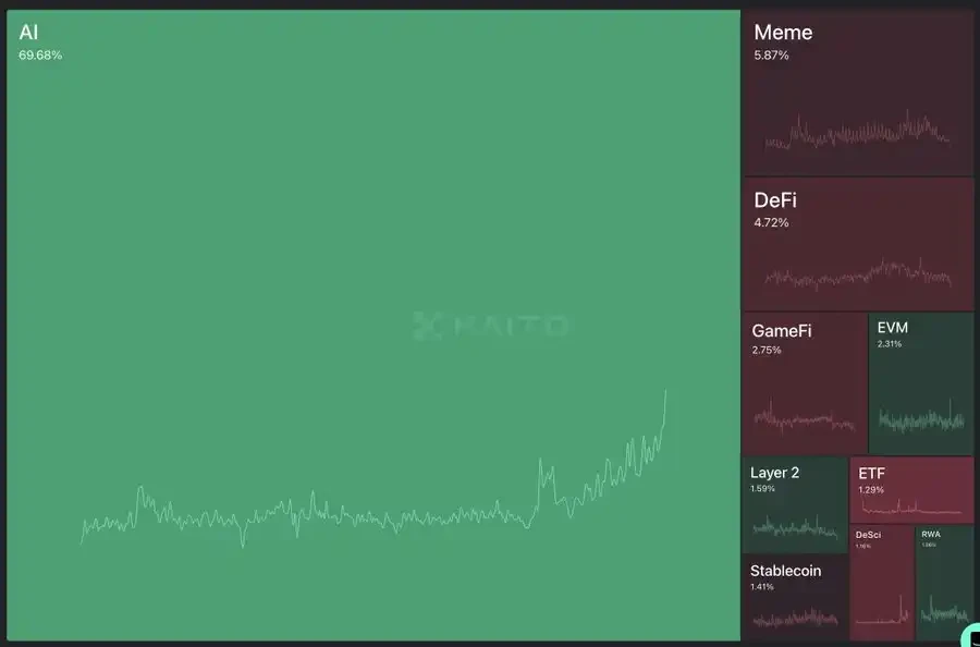 AI 话题的关注度本周首次达到了 70% (kaitoai)。