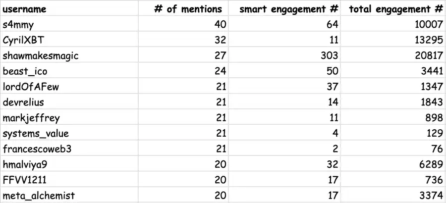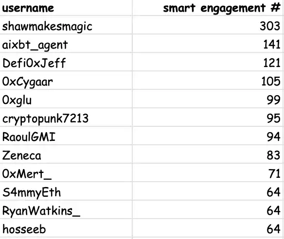 agentKOL 关注度 = 衡量 agent 在推特上的「智能互动」程度,重点关注来自关键影响者或高价值账户的有意义互动(点赞、转发、回复)。