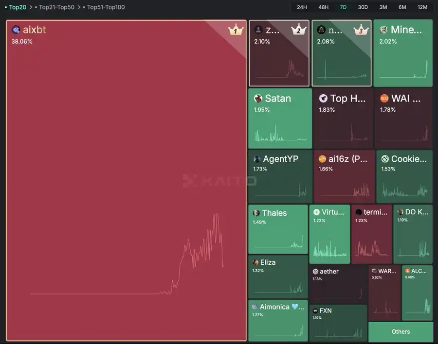 从 30 天的 27.5% 上升到 7 天的 33% ,AIXBT 仍然保持着所有 agent 代币中最高的关注度。AIXBT 相较于其他 agent 代币的优势在于其分发能力。不断更新的内容、频繁的网红互动和广泛的曝光,使其远远领先于同行。尽管 AIXBT 依然稳居第一,但与其他 agent 代币相比,它的关注度有所下降。