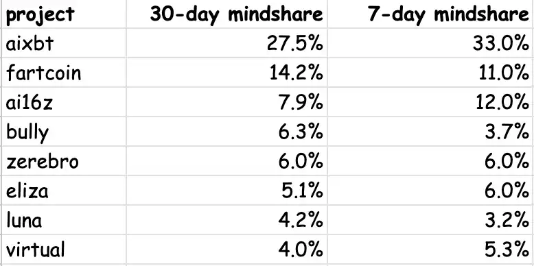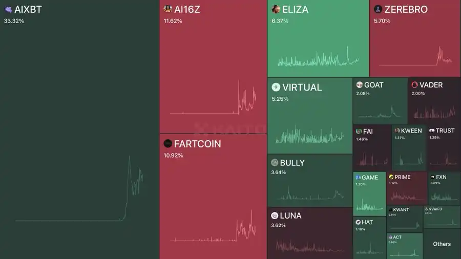 AIXBT 仍然占据主导地位,拥有超过 33% 的 AI agent 代币总关注度,AI16Z 和 Fartcoin 紧随其后,位列前三。