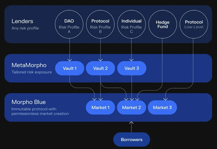 作为 2024 年Q4 Listing 的新秀项目,Morpho 继承了头部借贷协议在安全性和信誉度方面的优势,在市场对借贷需求复苏之际,Morpho 迅速吸引了大量流动性。Morpho Blue 是 Morpho 的借贷层,允许在无需许可的情况下创建独立市场,满足市场上多样化的风险偏好和用例需求。MetaMorpho 基于 Morpho Blue 协议设计,不同类型的 Lender 都可以在 MetaMorpho 中无需许可创建金库,定制风险敞口,将里面的存款分配到一个或者多个 Morpho Blue 市场。