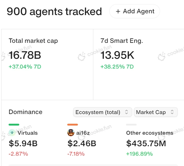 AI Agent 市值和占比,来源:https://www.cookie.fun/
