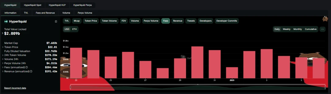 Hypeliquid 的收入,来源:https://defillama.com/protocol/hyperliquid?tvl=false&fees=true&groupBy=daily