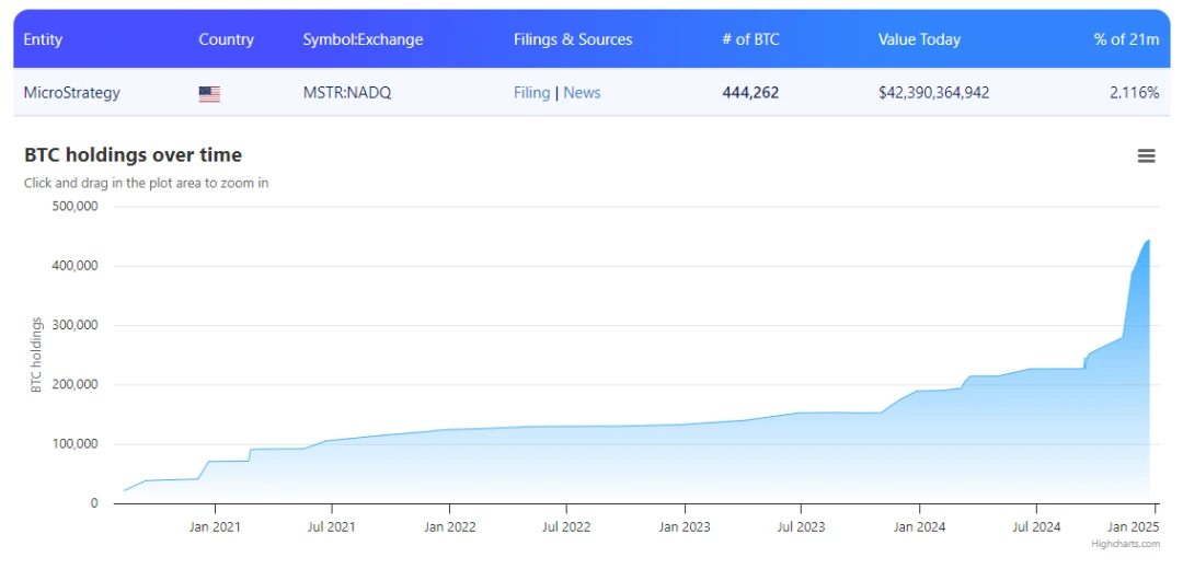 在特朗普胜选之后,MicroStrategy 对比特币的投资力度显著加大。根据最新数据,该公司在 2024 年Q4新增购买了近 15 万枚比特币,总花费接近 135 亿美元,平均成本约每枚 9 万美元。相较之下,比特币现货 ETF 的总净资产值从Q3末的 600 亿增长至Q4末的近 1100 亿,新增资金流入达 500 亿,而 MicroStrategy 一家的购买量就接近所有比特币现货 ETF 净流入的 25% 。另外,MicroStrategy 还计划通过特别股东大会提出高达 210 亿美元的股权融资和 210 亿美元的债券发行,继续投资比特币。MicroStrategy 的 CEO Michael Saylor 也积极推动更多传统巨头投资比特币,例如微软,尽管微软股东投票反对了相关提案。市场对 MicroStrategy 的持续购买行为既感到期待又有所担忧,一方面期待其与传统巨头共同推动加密行业的发展和比特币新高,另一方面也担心可能出现的黑天鹅事件导致市场动荡。