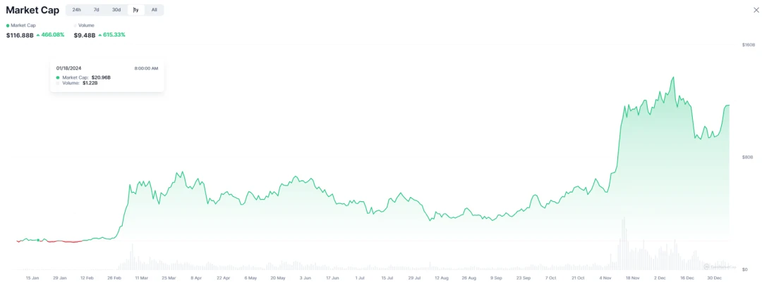 结合 Meme 赛道过往一年的相关数据,截至 2023 年年底,市值前 500 的 Meme 数量极为有限,主要包括 DOGE、SHIB、BONK、PEPE、FLOKI 和 ELON 等少数几个,而大多数 Meme 市值较低。然而,到了 2024 年年底,市值前 500 的 Meme 数量显著增长至 48 个,占比接近 10% ,并且总市值达到约 1047 亿美元, 24 小时交易量高达 74 亿美元。这些都在表明 Meme 的认可度和市场共识正在不断突破。