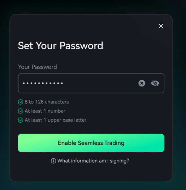 相比之下,MYX Finance的“无感交易”给用户提供了“傻瓜式一键体验”。用户登录钱包之后,授权“无感交易”,只需要设置好密码,就可以开通该功能——在这之后,只要钱包里有USDC,就可以随时开单交易,不需要设置繁杂的选项,可以随意更换设备/网页,毫不影响交易体验,真正在链上实现了1:1的CEX体验还原。