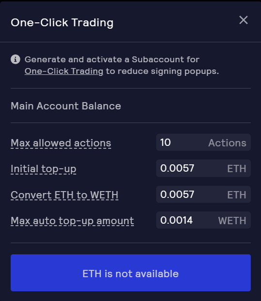 而GMX上线的“One-click Trading”, 核心逻辑和Hyperliquid相似,用户选择开启该功能后,仍需要设置最大允许交易笔数、初始充值(手续费)等,属于“半人工半自动化”,用户的认知门槛还是很高,使用起来也并不会特别方便。