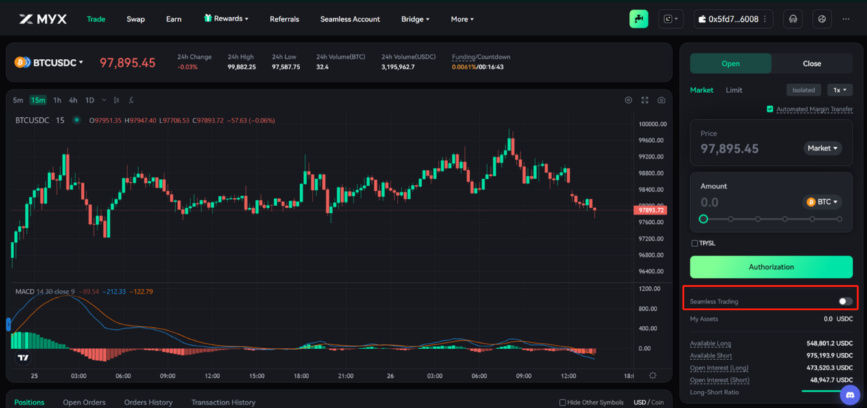 “无感交易”正是MYX Finance针对这一问题提出的解决方案。通过“加密抽象”技术,MYX Finance的“无感交易”整合了DEX的安全性和CEX的易用性——通过完全去中心化的底层技术,为用户省去了传统DEX的繁琐操作——MYX Finance的用户只需要点击“无感交易(Seamless Trading)”,一键授权,就可以获得完全等同于CEX的简易、流畅的交易体验。