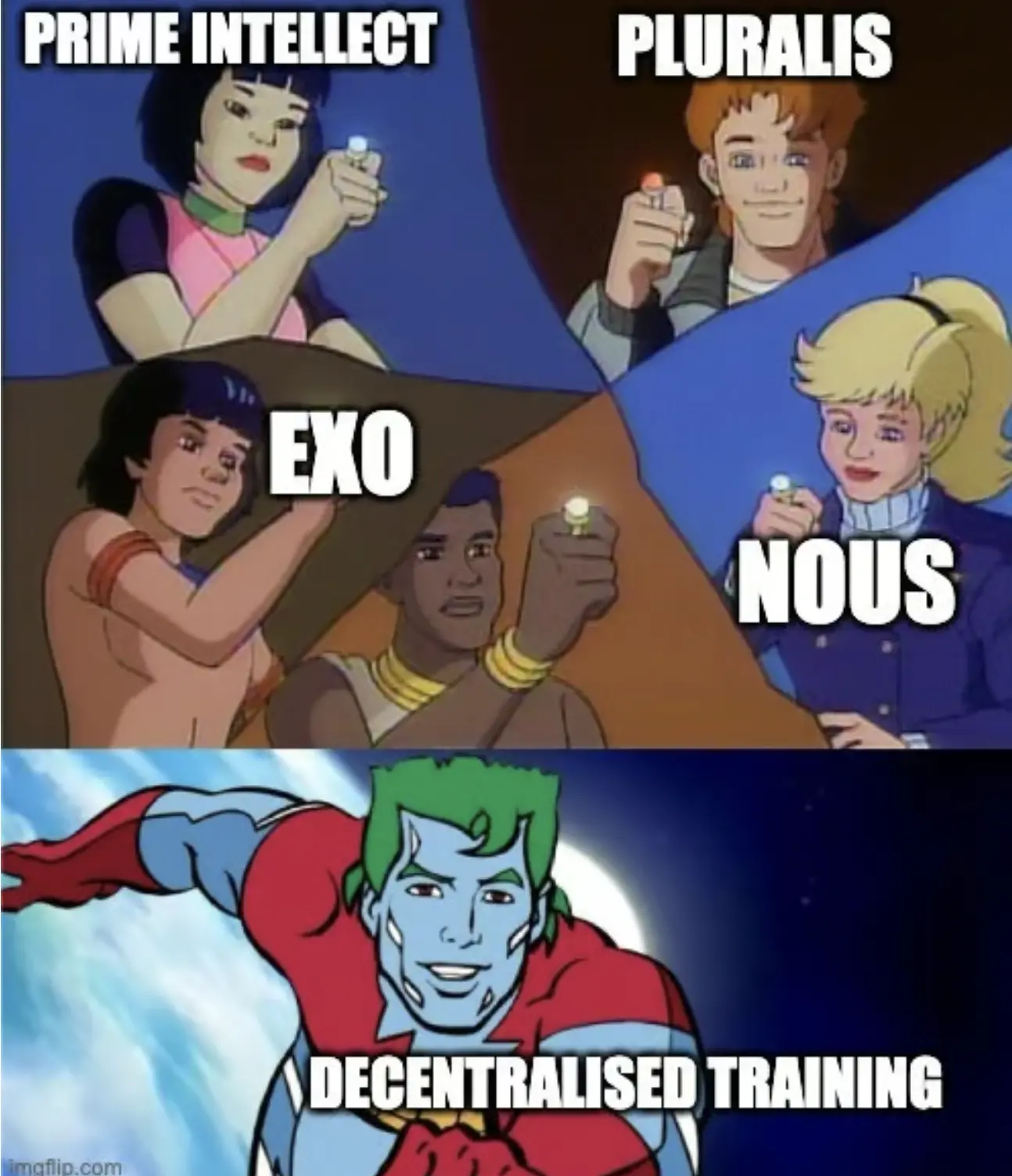 2024 年,像 Prime Intellect 和 Nous Research 这样的先驱者突破了去中心化训练的界限。我们已经在低带宽环境中训练出了一个拥有 150 亿参数的模型,这证明了在传统的集中式方式之外进行大规模训练是可行的。
