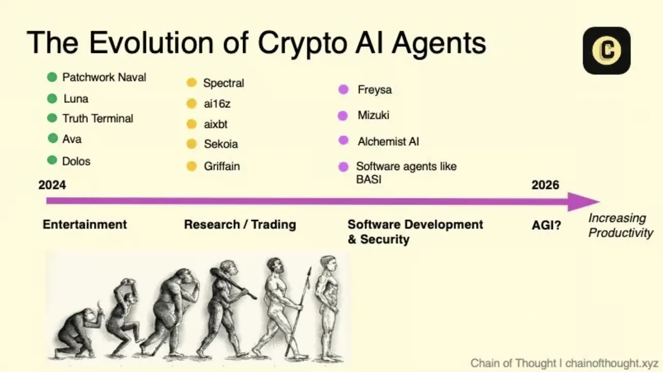随着人工智能涵盖从智能合约平台到 Memecoin、去中心化物理基础设施网络(DePIN),以及像代理平台、数据网络和智能协调层等新原语,它与 DeFi 和 Memecoin 平起平坐是必然趋势。