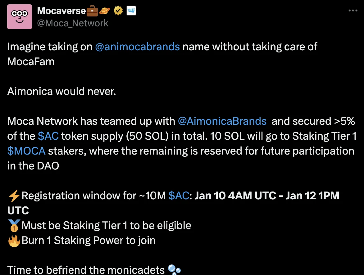 不仅如此, 昨日 ai16z 创始人 Shaw 在 X 平台转发 Animoca Brands 与 ai16z 合作的推文 ,并向外界传递看好本次合作的信号。更引人注目的是昨晚 Mocaverse 官推竟也宣布与 Animoca 合作,并获得 AC 代币超 5% 的代币供应量(50 SOL 白名单份额),其中 10 SOL 白名单份额将给 MOCA 代币 T1 级别质押者。