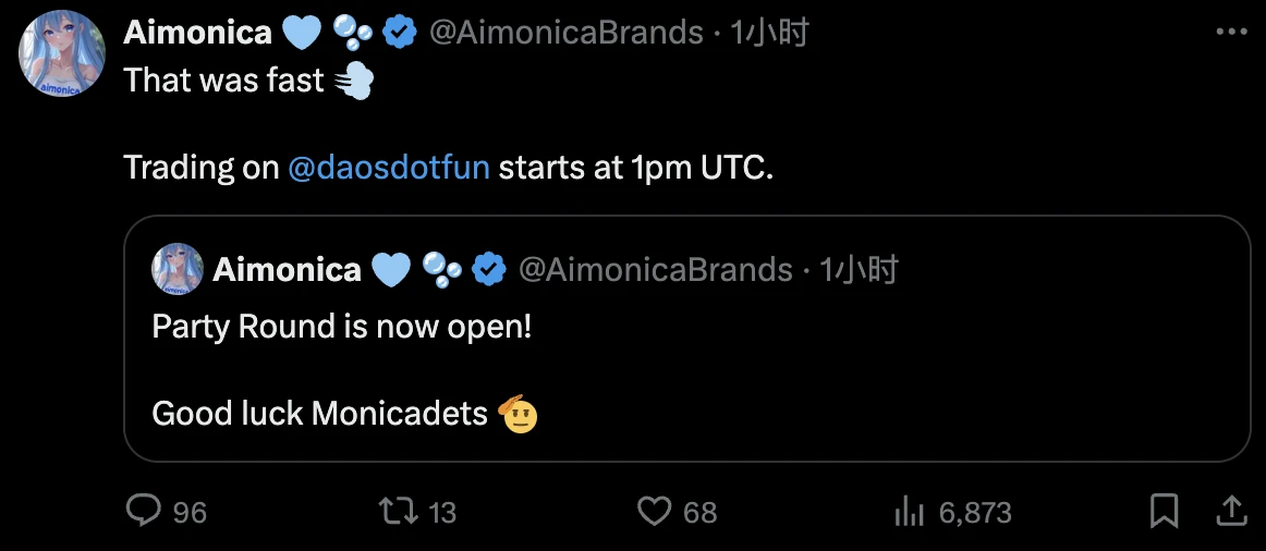 根据官方消息, AI Agent 项目 Aimonica Capital(AC)已在 daos.fun 平台完成 888 枚 SOL 募集, 并将于北京时间今晚 9 点开放交易。 Aimonica Capital(AC)或将超越 DeSci 项目 Big Pharmai(DRUGS),在今晚续写 daos.fun 的造富神话。