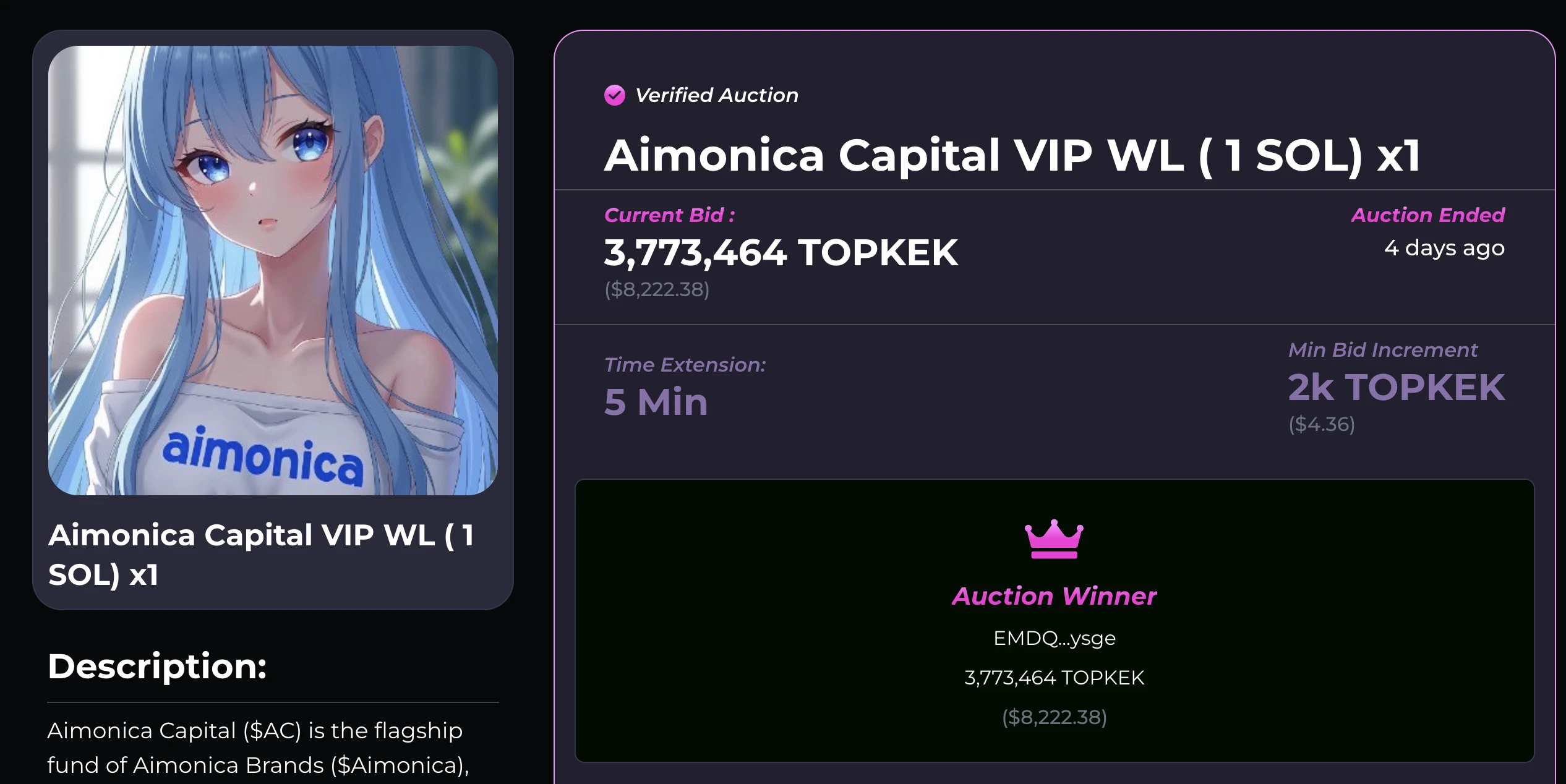 Aimonica Capital(AC)或成为下一个“速通盘”,因为在此前的白名单拍卖阶段,市场已经表现出极高的购买热情。 该项目在与 TOPKEK Capital 合作拍卖 AC 代币白名单的两轮活动中,第一轮拍卖 0.5 SOL 的白名单份额,最终拍卖价为 1,903,462 枚 TOPKEK 代币,价值约合 4100 美元;第二轮拍卖 1 SOL 的白名单份额,最终拍卖价为 3,773,464 枚 TOPKEK, 价值约合 8200 美元。