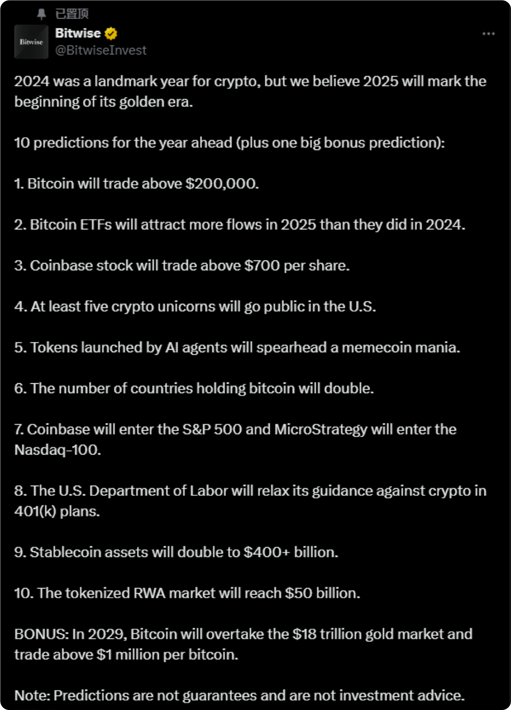 当前的fomo情况大家都有目共睹,机构们纷纷在此关头给出未来预测:美国最大的加密基金指数Bitwise预测比特币在2025年将达到20万美元。Bitwise团队认为,Coinbase会进入标普500指数,2025年会是比今年更加狂欢的一年。