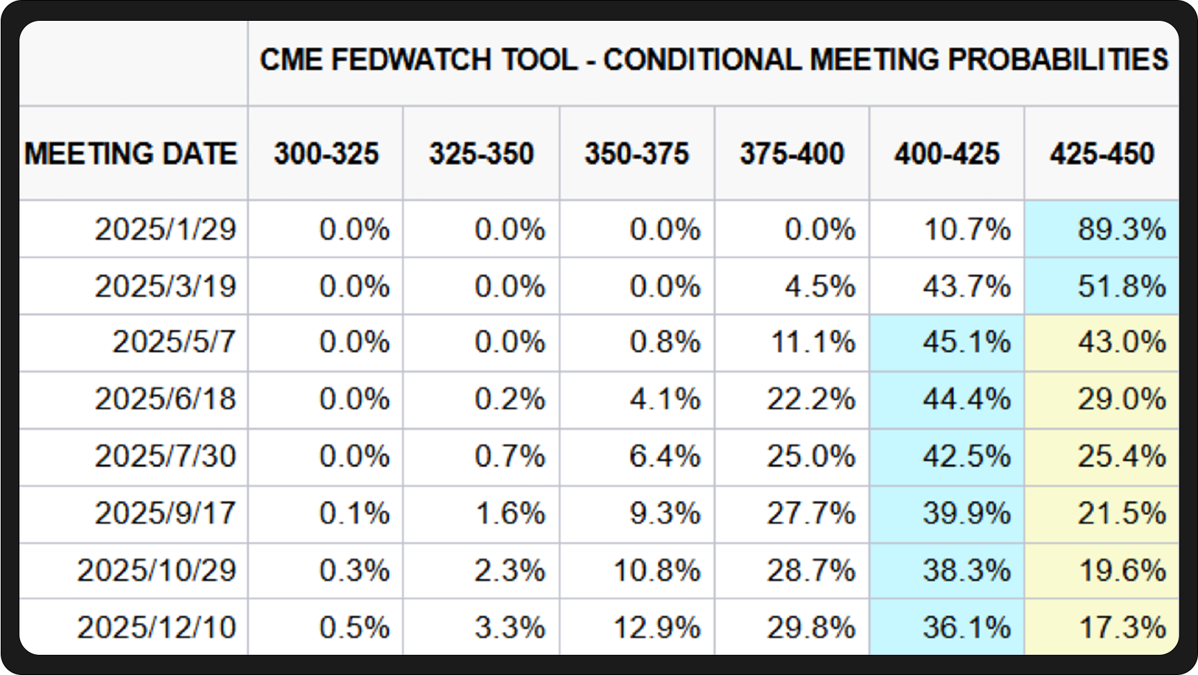 美国12月新公布的经济数据基本在预期之内:11月非农就业人数增加22.7万,略好于市场预期(预期22万);11月CPI同比增长2.7%,环比增长0.3%,均符合预期。随后,宣布将联邦基金利率目标区间下调25个基点到4.25%至4.50%之间,符合预期。然而,美联储在宣布完降息之后“补刀”了一句:预计2025年降息幅度或收窄至50个基点。这无疑给市场泼了一盆冷水,因为这意味着25年降息次数从之前预计的4次下降为2次,这也让市场预期明年一月美联储不会降息。受美国鹰派降息影响,美股和币圈当天出现大跌。