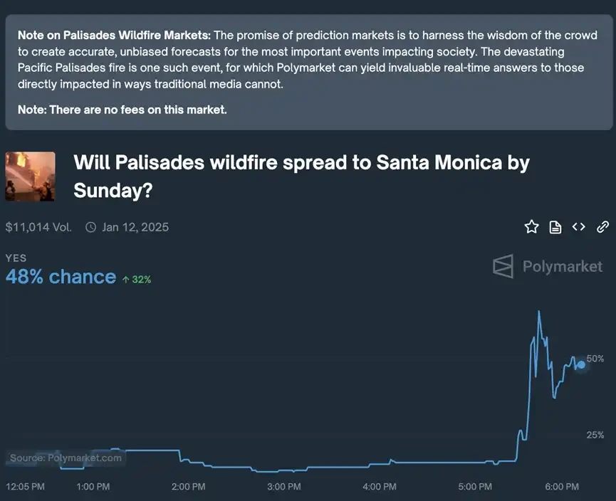 为了在至少 10 个不同的野火市场中减轻自身责任,Polymarket 添加了一条简短的免责声明,声称其利用「群众智慧」来创建「准确且客观的事件预测」。该声明称:「毁灭性的太平洋帕利塞兹(Pacific Palisades)野火就是这样的一个事件,Polymarket 能够以传统媒体无法实现的方式,为直接受到影响的人提供宝贵的实时答案。」