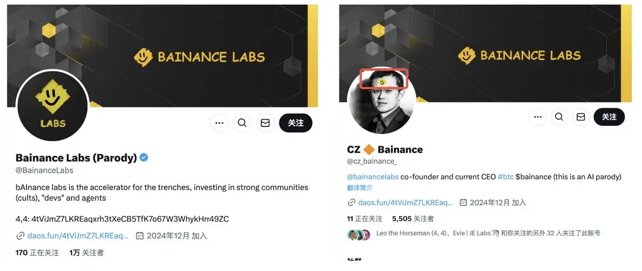 更有意思的是,项目还做了全套的戏,关联账号 CZ Bainance (@cz_bainance_)、@bainance_intern(Bainance 实习生账号)、@bAI_Research(研究部门账号) ;