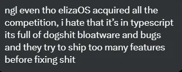 一位与 Eliza(ai16z)密切合作的开发者提到:“老实说,尽管 ElizaOS 已经收购了所有竞争对手,但我非常讨厌它基于 TypeScript 开发。这个系统充满了臃肿的功能和大量漏洞,而他们总是在修复问题之前急于推出过多的新功能。”