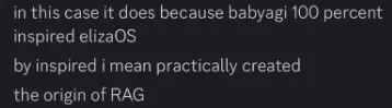 “在这种情况下,这种说法确实成立,因为 ElizaOS 的灵感完全来源于 BabyAGI。这里的“灵感”几乎可以理解为,BabyAGI 实际上奠定了 RAG (Retrieval-Augmented Generation,检索增强生成) 技术的基础。”
