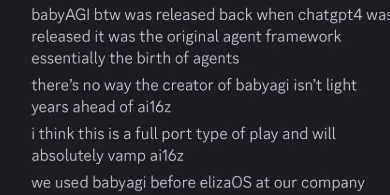 事实上:“BabyAGI 是在 ChatGPT-4 发布时推出的,它是最早的智能体框架,可以说是智能体技术的起源。BabyAGI 的创造者无疑远远领先于 AI16z。我认为 ElizaOS 的开发更像是一次彻底的框架移植,而且几乎可以肯定会全面超越 AI16z。我们公司在使用 ElizaOS 之前就已经在内部使用过 BabyAGI。”