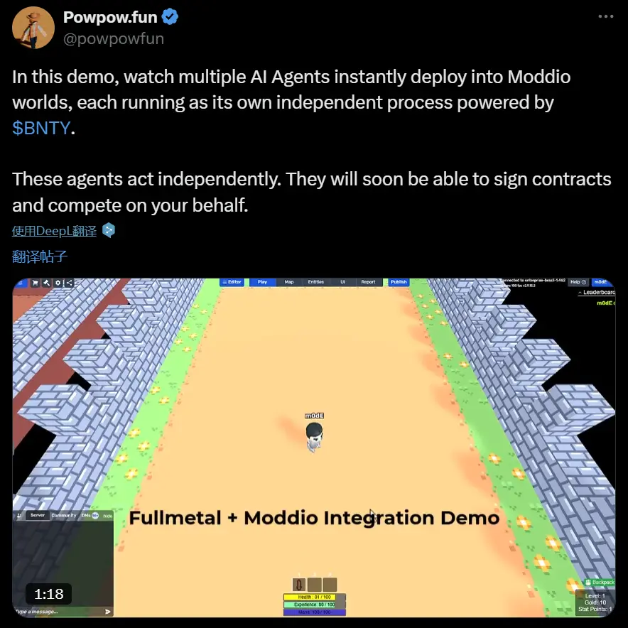 平台内置了 FullmetalAI 的开源大语言模型(LLM),创作者可以直接在游戏中发布 AI 代理,使游戏更加动态和有趣。