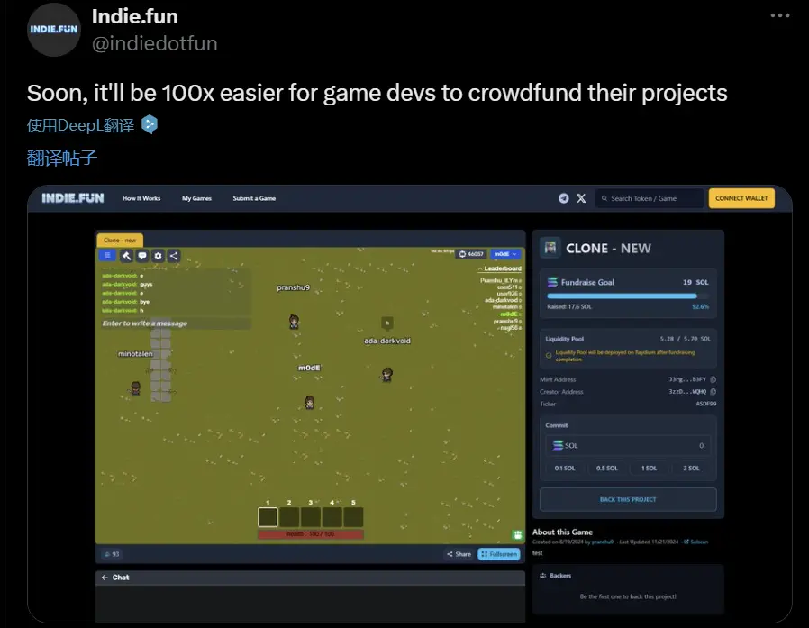 团队计划在大约一周内推出 @indiedotfun。Indiedotfun 类似于 @pumpdotfun,但针对的是游戏,它允许任何人快速使用 @moddio 提供的模板和游戏/物理引擎来构建自己的世界。这些世界可以被标记化,使用户和社区能够获得他们最喜欢的游戏的所有权。