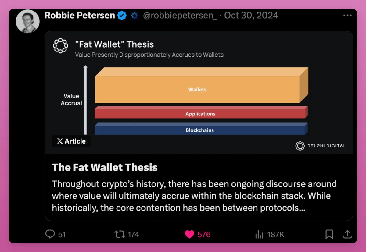 OP 超级链以及 Polygon、zkSync 等类似的联盟正在提升后端用户体验。另外,如果 Delphi Digital 关于「Fat Wallet」理论的预测成立,那么用户体验问题最早可能会在 2025 年就得到解决。