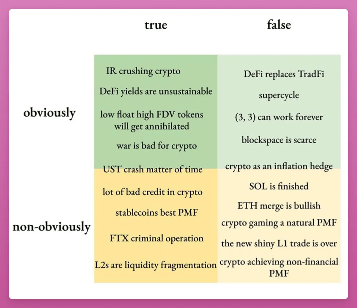 Matti 曾在评估 Zee Prime Capital 的投资时推出了一个问题框架:「如果你听到当前的讨论和叙事,你认为什么是显而易见的真相,什么是明显的谎言?又有哪些是不明显的真相,以及不明显的谎言?」