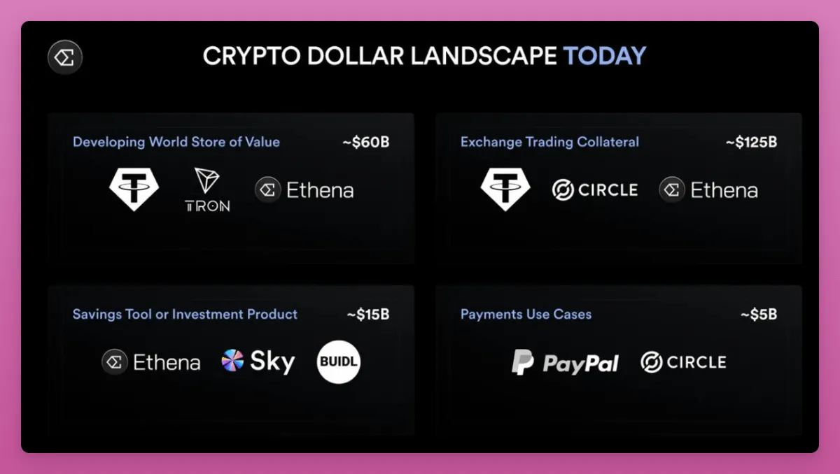 尽管这些类别在今天相对较小,但它们在未来两年内可能推动超过 500 亿美元的新资金流入(根据 Ethena 的预测)。Ethena 和 Sky 已经在储蓄领域处于领先地位,而 sUSDe 也将受益于传统金融的整合。