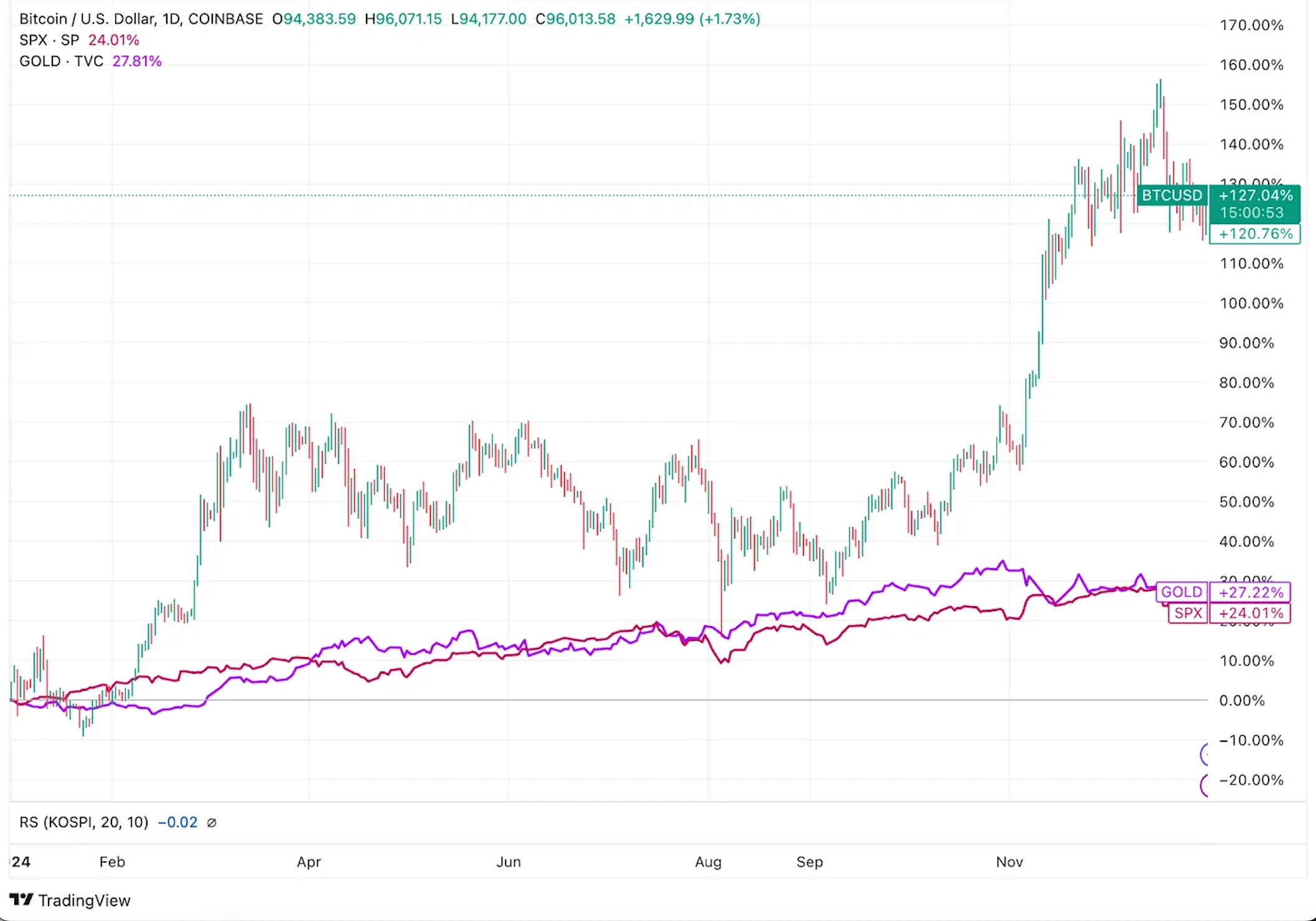 2024 年,比特币的回报率约为 127% ,大幅超过同期上涨 27% 的黄金和上涨约 24% 的标准普尔 500 指数。